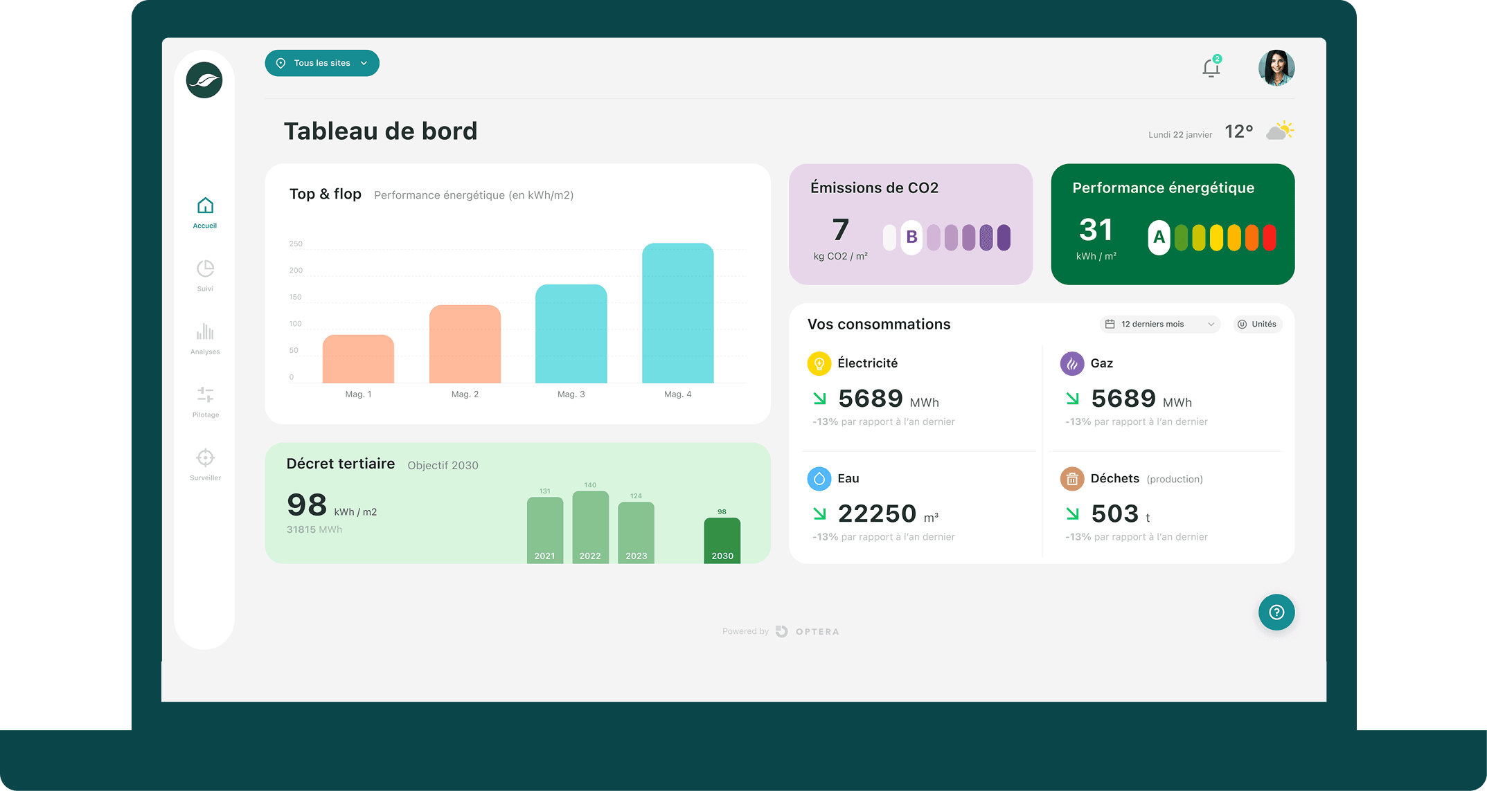 - Suivez vos objectifs de réduction dans le cadre du décret tertiaire et assurez vos obligations déclaratives sur la plateforme OPERAT (ADEME)